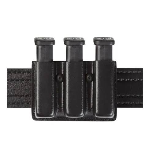 The Model 775 Triple Magazine Pouch is designed to carry three magazines on a 2.25 (58mm) duty belt. The 775 features vertical belt slots. A magazine tension screw located between the two pouches allows for easy retention adjustment. It’s constructed of rugged SafariLaminate and is available in several scuff-resistant finishes with four different closures.