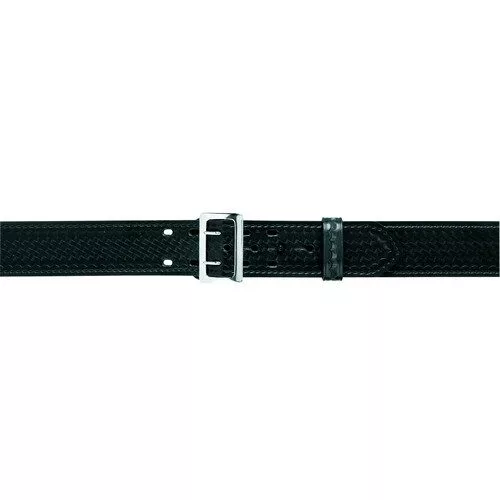 This Model 87 Sam Browne duty belt features SafariLaminate construction with suede lining. This four-stitch design has the Sam Browne-style double tongued buckle and center belt stud to fasten it firmly around the waist. 2.25 (58mm) width. Available in Plain, Basketweave, Hi-Gloss or Nylon-Look finish. Choose brass or chrome buckle.