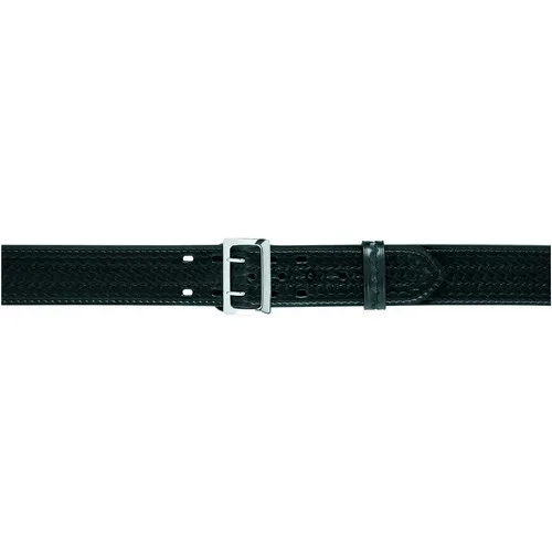 The Model 875 Sam Browne duty belt features SafariLaminate construction. It features a border stitch and is unlined. It has the Sam Browne-style double tongued buckle and center belt stud to fasten it firmly around the waist. 2.25 (58mm) width. Available in Plain, Basketweave, Hi Gloss or Nylon-Look finish. Choose brass or chrome buckle.