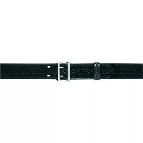 The Model 875 Sam Browne duty belt features SafariLaminate construction. It features a border stitch and is unlined. It has the Sam Browne-style double tongued buckle and center belt stud to fasten it firmly around the waist. 2.25 (58mm) width. Available in Plain, Basketweave, Hi Gloss or Nylon-Look finish. Choose brass or chrome buckle.