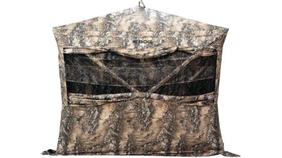 The BOG Grave Digger Ground Blind is engineered to provide max space for up to 4 hunters. Features StealthZip silent zip technology 360 degree curtain windows with StealthTrac a double-width door and an asymmetrical shape that allows standing height shooting