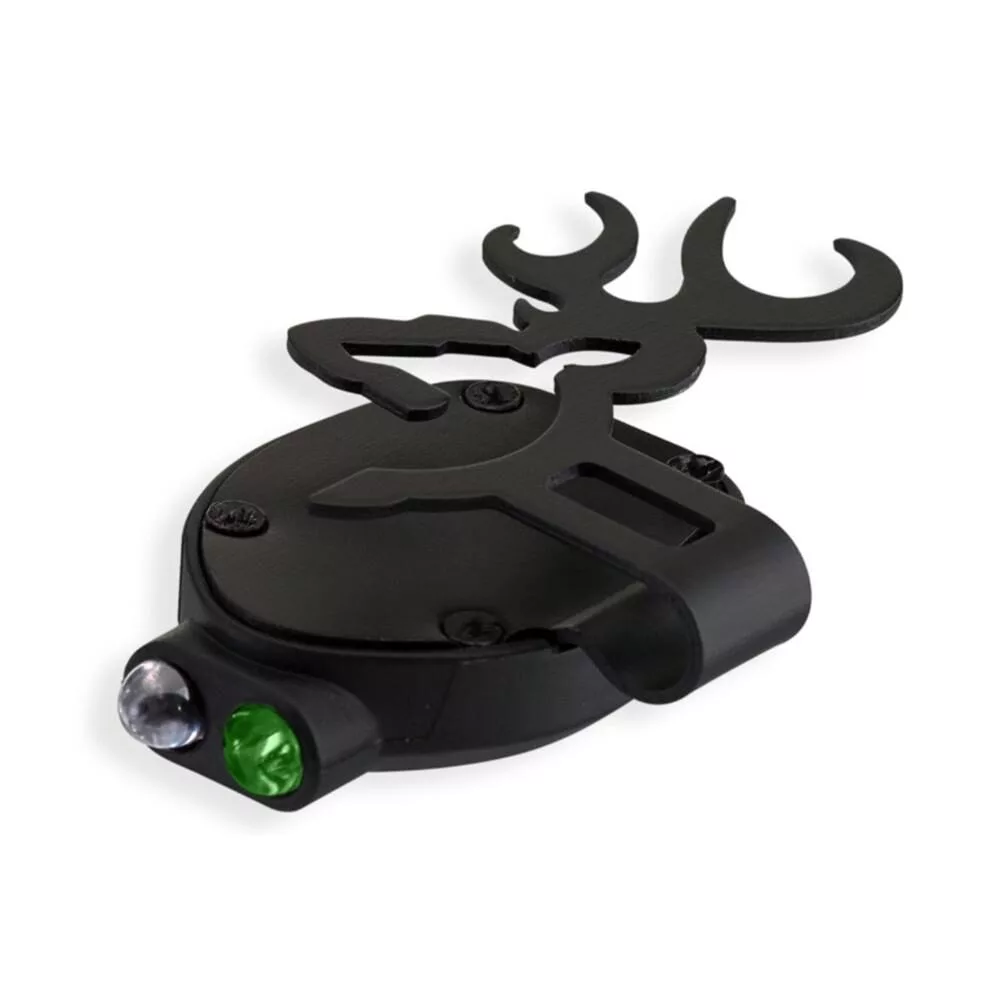 Compact lightweight and decorative design attaches to the side of a hat brim. Long-lasting battery life locking push-button switch white and green LEDs batteries included.