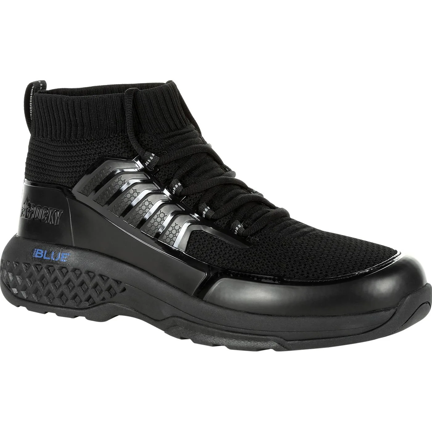 The Rocky Code Blue collection features a sleek athletic design and incorporates innovative materials to make a durable shoe that offers all-day comfort where you need it the most. This non-metallic slip on or lace up public service shoe is constructed with a highly breathable tactical grade knit upper, high-abrasion TPU overlays for added structure, stability, and support and reflective accents on the webbing. This shoes cement construction makes it light and flexible and its oil and slip resistant rubber outsole with a wider stance allows you perform in many environments without hesitation. Experience comfort in every step with our patented Comfort Tracks footbed. This combined with our Rocky Rebound EVA midsole and a fiberglass shank for added stability allows you to confidently go about your day in comfort. This shoe also features a KulKote thermal regulating lining, which helps regulate your body tempter providing a more comfortable experience. If you’re looking for a shoe that offers an athletic appeal that is lighter, more flexible, and durable that offers all-day comfort the Code Blue collection is perfect for you.