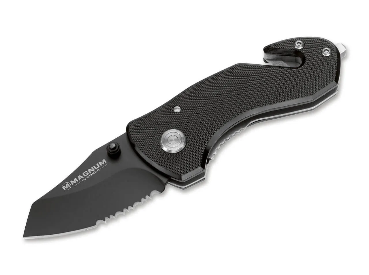 This small Rescue Knife Magnum Black Rescue should not be underestimated! The partially serrated, black coated 440 stainless steel blade is securely locked by the linerlock mechanism. Includes belt cutter and glass breaker in the closed position. The black anodized aluminum handle features a pocket clip and can thus be used as original money clip.