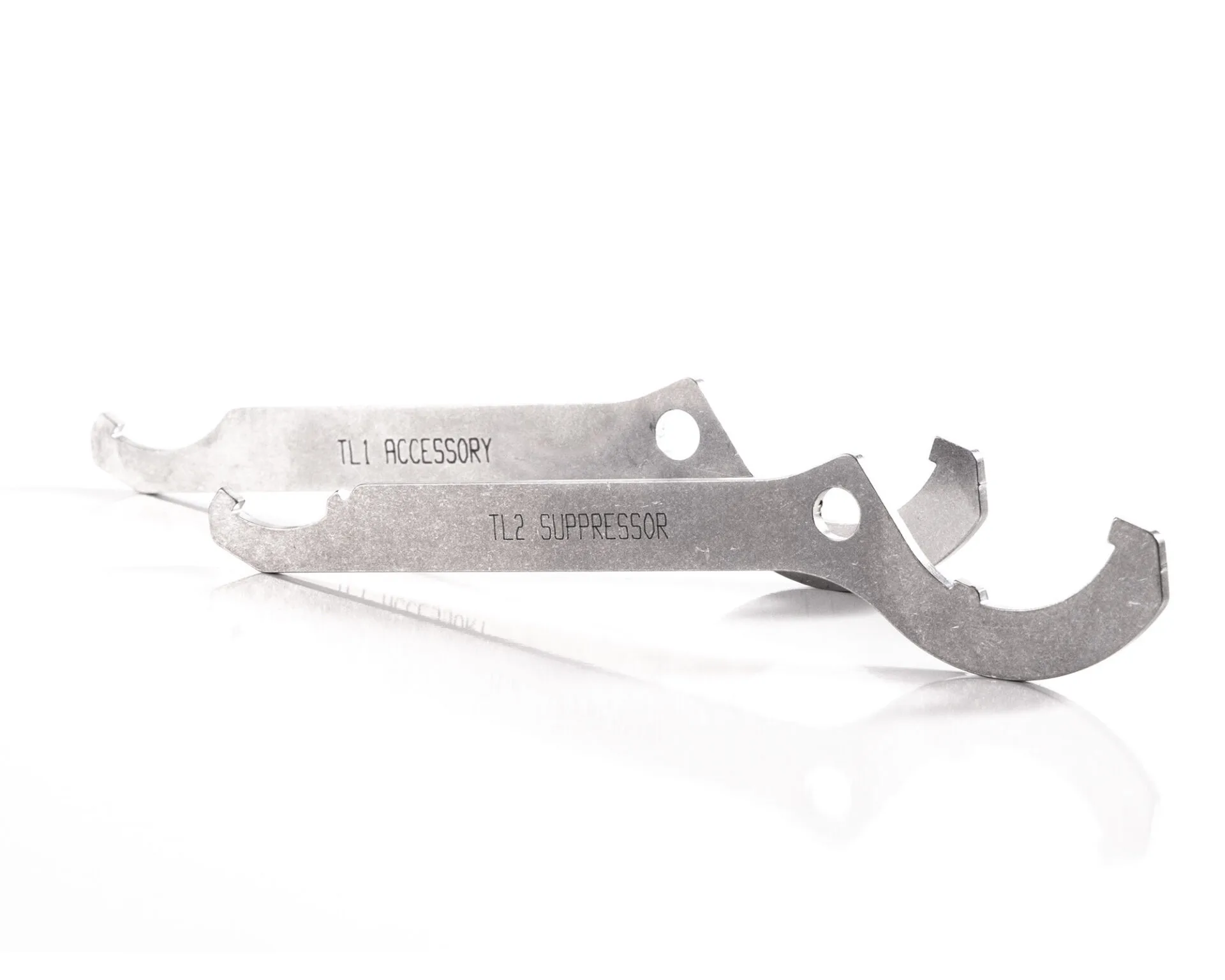 This is an Accessory and Suppressor hook spanner wrench pack. The wrenches work with KeyMo and KeyMicro adapters, All Xeno Adapters, Pyro 2.0, as well as P-series and R-series direct thread mounts. The TLPACK contains two (2) TL1 wrenches sold together in a pack for both installation and removal of accessories and suppressors.