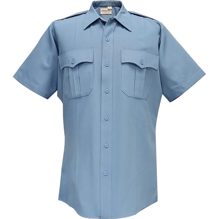 The Deluxe Tropical public safety shirt is made of 65% polyester and 35% rayon and have a tropical weave for warm climates. This is a short sleeve public safety shirt with cross-stitched shoulder straps, a seven-button placket front, and military-style creases. Each shirt comes with pleated pockets with scalloped flaps to hold all your tools. There is also a pencil stitch in one pocket.