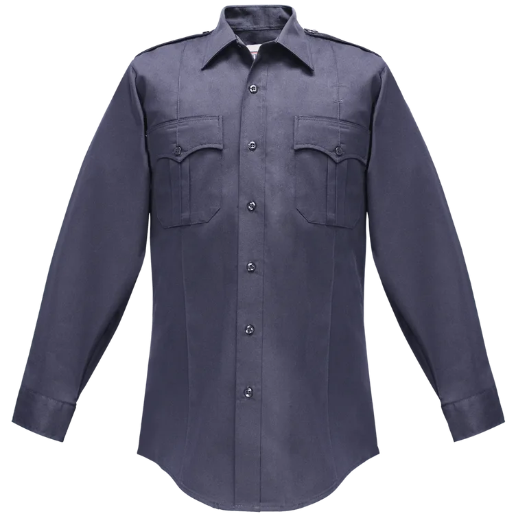 This Duro Poplin shirt is made of 65% polyester and 35% cotton to bridge the gap between comfort and durability. It comes with well-designed cross-stitched shoulder straps to create a professional look. This shirt has a seven button placket front with plain front pockets with mitered flaps. It has five sewn-in silicone creases that last the life of the garment. The shirt has a full badge sling and comes with a hidden pen compartment in the left breast pocket.