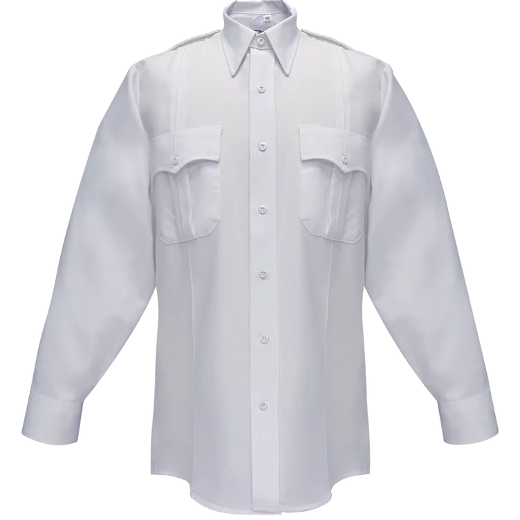 This Duro Poplin shirt is made of 65% polyester and 35% cotton to bridge the gap between comfort and durability. It comes with well-designed cross-stitched shoulder straps to create a professional look. This shirt has a seven button placket front with plain front pockets with mitered flaps. It has five sewn-in silicone creases that last the life of the garment. The shirt has a full badge sling and comes with a hidden pen compartment in the left breast pocket.