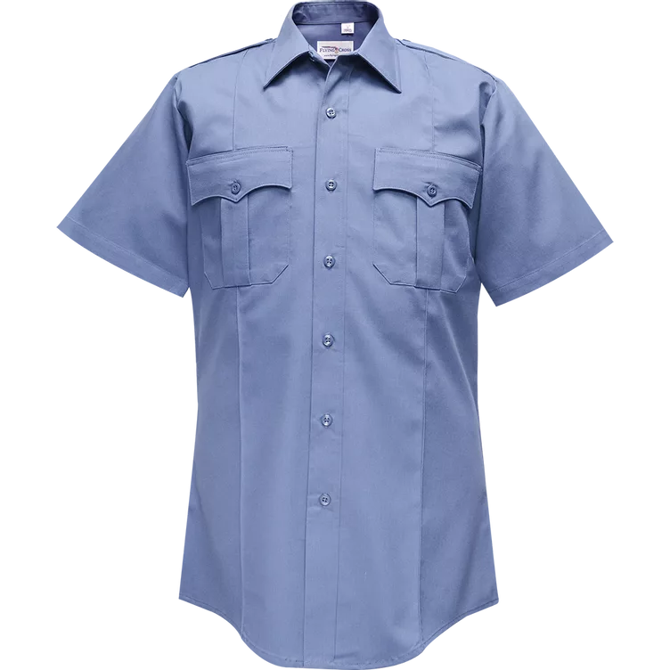 Made in a Duro Poplin style for public safety professionals, this shirt has short sleeves. It is made of 65% polyester and 35% cotton with a seven-button placket front. The shirt has symmetrically cross-stitched shoulder straps for a neat appearance and five sewn-in creases to remove the need for ironing. It offers a full badge sling and comes with a hidden pen compartment in the left breast pocket. The shirt has pleated pockets with scalloped flaps and a Velcro closure. It has a convertible sport collar and comes with a set of permanent collar stays.