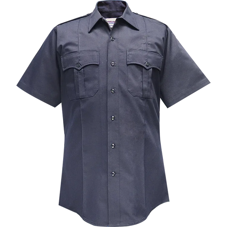 Made in a Duro Poplin style for public safety professionals, this shirt has short sleeves. It is made of 65% polyester and 35% cotton with a seven-button placket front. The shirt has symmetrically cross-stitched shoulder straps for a neat appearance and five sewn-in creases to remove the need for ironing. It offers a full badge sling and comes with a hidden pen compartment in the left breast pocket. The shirt has pleated pockets with scalloped flaps and a Velcro closure. It has a convertible sport collar and comes with a set of permanent collar stays.