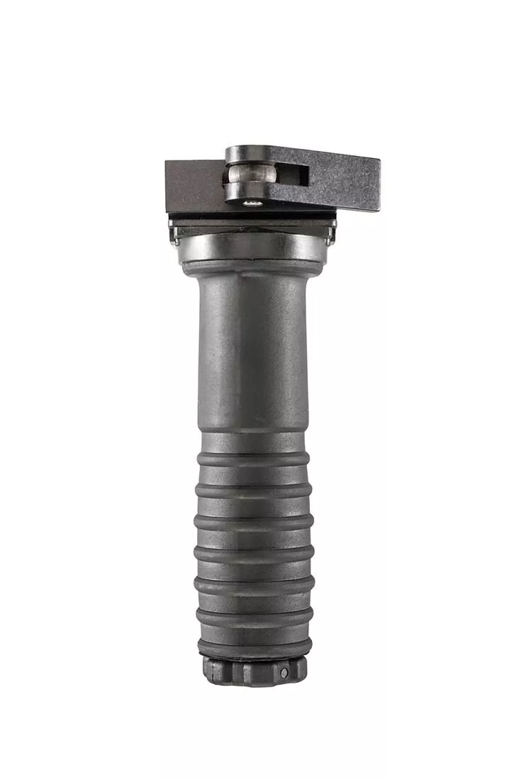 Ambidextrous overmolded rubber XPRESS mounted vertical forward grip with capped storage compartment.