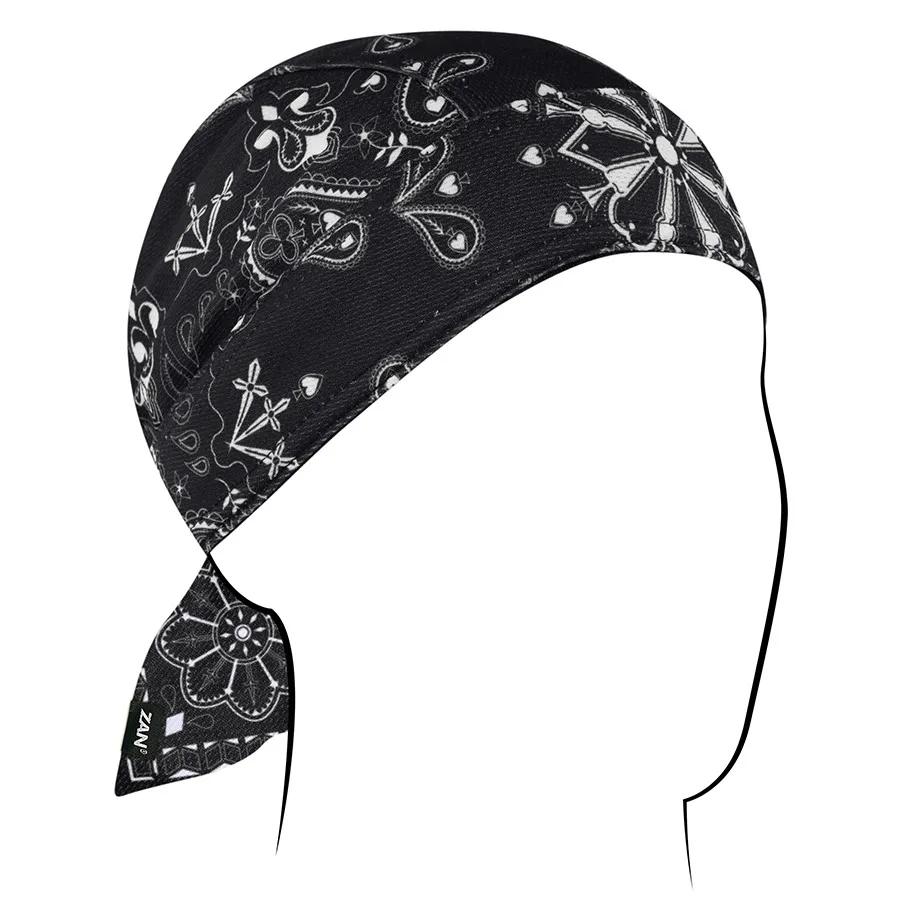The ZANheadgear Flydanna is a bandanna that has been sectioned into 6 panels and transformed into a headwrap. By keeping sweat from a rider’s eyes and preventing sweat and skin oils from soiling helmet liners, the Flydanna works well as moisture barrier underneath a helmet. Additionally, the Flydanna keeps hair from getting snagged on earrings or tangled in the wind.