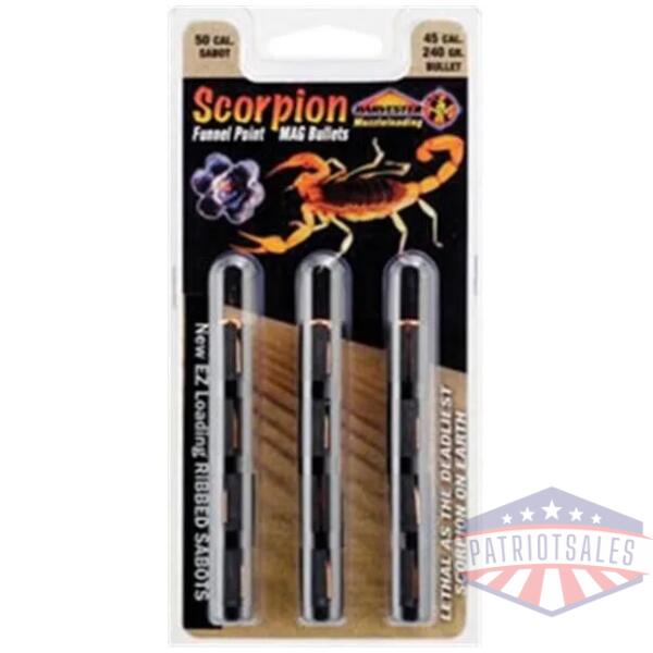 Harvester Muzzleloading Scorpion Funnel Point Bullets are electroplated with copper plating that does not separate from the lead core as with most jacketed bullets. Scorpion Funnel Point MAG Bullets operate to specs of all muzzleloaders. Packaged with Crush Rib Sabots excluding the 54 caliber packs.