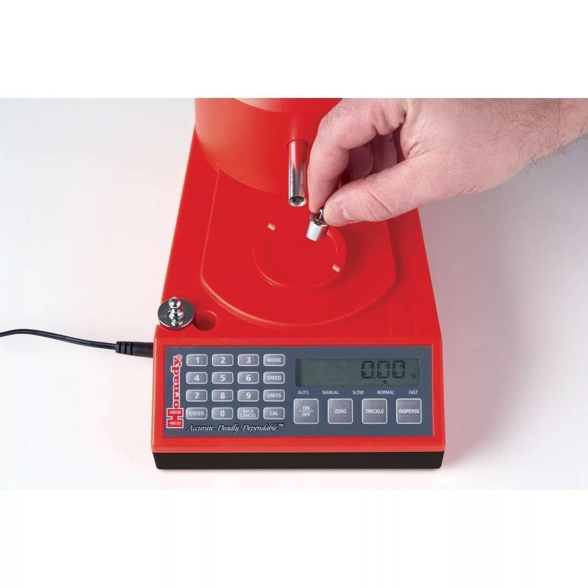 An easy-to-use keypad coupled with a large easy-to-read backlit display automatic & manual dispense options trickle function three speed settings overcharge protection and easy clean out make this the single most effective powder measure on the market. When it comes to the competitors there aren’t any who measure up!