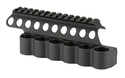 SureShell shotshell carriers for the Beretta 1301 feature mounting brackets with integral top Picatinny sight rails. Using the top mounting screw holes found on the Beretta 1301 shotguns, the SureShell shotshell carriers are thus slung on the left side of the receiver, securely fastened at the top. No other shell carrier mounting method is as secure or looks as good. The Picatinny rails are machined from aircraft grade 6061-T6 aluminum, which are mil-spec hard anodized and provide an extremely durable non-glare matte finish. The basic saddle rail design provides a robust mounting platform suitable for mounting a variety of optical sights, while a second version, which is nearly identical to the basic version, also includes a Mesa Tactical four, six, or eight shell SureShell shotshell carrier mounted on the left side of the receiver. Both versions are manufactured in compliance with MIL-STD-1913 Picatinny specifications, and no gunsmithing is required for installation.