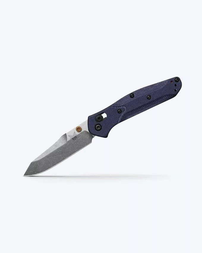 As hardworking and ruggedly handsome as a pair of blue jeans, the new 940-04 Osborne is our nod to those who like to get their hands dirty and boots dusty, just like us. Evolved from the iconic folder that first began as a versatile ranch knife — and seamlessly doubles as the ultimate EDC — the new 945-04 Mini Osborne features an M390 reverse tanto blade with a satin finish. A pared-down version of the full-size Osborne, the 945-04 is kitted out with textured blue denim micarta handle scales and dark copper PVD accents