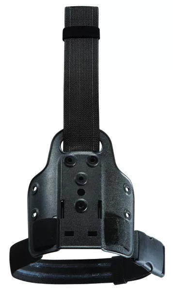 The 6004-10 is a single strap leg shroud. It features a 2 (50mm) elastic leg strap and a 2 (50mm) adjustable vertical web strap which attaches to the belt. Its small size allows for a lower profile carry and it is constructed using injection molded nylon for durability and flexibility. It features mounting holes for attachment of three Safariland tactical accessories or one holster with two accessories. The elastic strap features two silicone for non-slip traction. Offered in Black, FDE Brown, OD, Foliage Green or Coyote Brown.