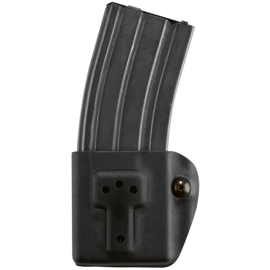 The Model 774 Rifle Magazine Pouch is designed to carry one rifle magazine on the belt. It features a Clip-On belt attachment that fits from 1.5 (38mm) to 2.25 (58mm) belt widths. The 774 is ambidextrous and is adjustable to carry angle on the belt. It’s constructed of rugged SafariLaminate and features a tension device to adjust magazine retention. Available in all STX colors and with MLS 16 or ELS 34 Locking Fork attached.