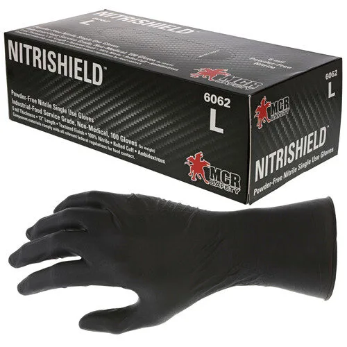 Nitrile gloves contain no latex proteins and offer excellent resistance to punctures and tears. They are three times more puncture resistant than rubber and can be used to offer superior resistance to many types of chemicals. The 6062 is a 6 mil black nitrile disposable glove that is powder free and measures 12 inches in length. This glove is an excellent alternative for individuals who experience allergic reactions to latex. Component materials comply with all federal regulations for food contact. Looking for the best nitrile disposable gloves? Look no further than MCR Safety!