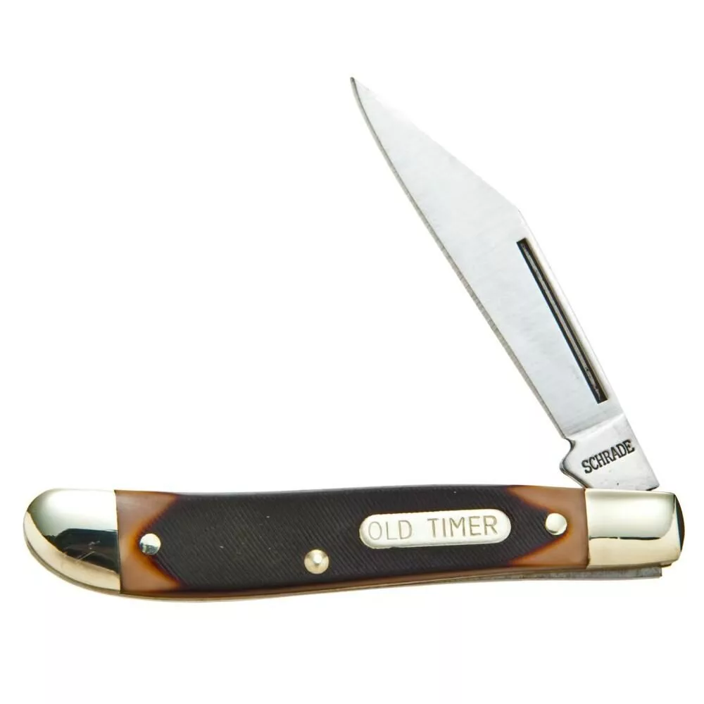 Since 1958 Old Timers have been found in the pockets of sharp outdoorsmen. The Schrade Old Timer Pal Single Blade Pocket Knife features saw cut Delrin handles 400-series stainless steel blades heat-treated back springs and brass pins for unmatched functionality and durability. Clip blade. Closed length: 3''. Weight: 1.1 oz.