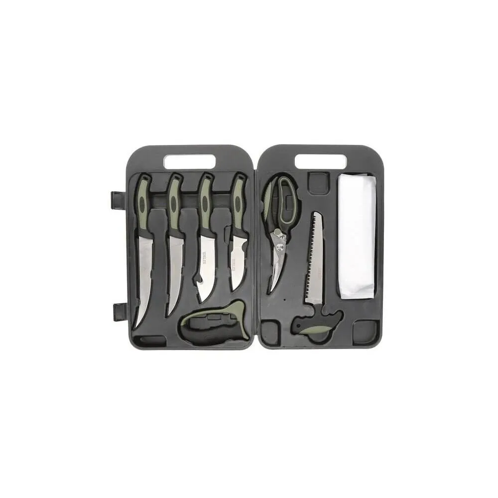 Old Timer Outdoor Kit has all the tools a hunter need in order to fully break down and process game. Each knife is designed with a comfort grip rubber handle and an included sharpener for repeated use. The durable roto-molded case with built in cutting board is easy to clean while protecting the gear inside no matter where the hunt takes you.