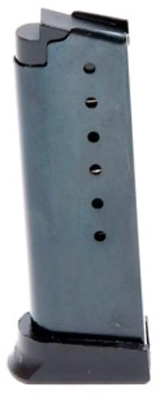A blue-steel magazine holding 8 rounds of 9mm ammunition for the Kahr K9 P9 and E9 pistol. This magazine comes with a follower and bumper/base plate made of an impact-resistant black polymer material; and uses heat treated Chrome-silicon wire for reliable feeding and long spring life. The magazine extends past the bottom of the grip-frame slightly.