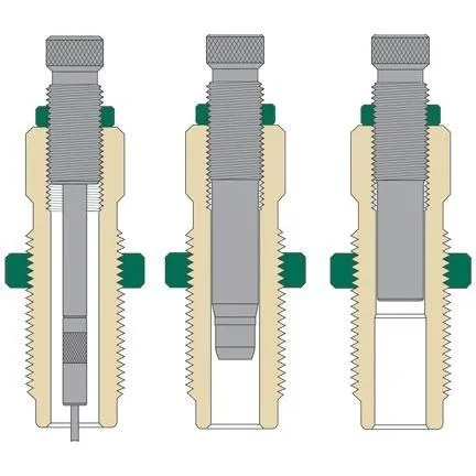 Titanium carbide differs considerably from other carbides and is the ideal material for resizing cartridge cases. Titanium carbide has the highest hardness of any readily available carbide. The difference is in the microstructure. Viewed under a microscope it appears smooth and rounded which presents a slippery non-galling surface ideal for lubeless resizing of cartridges. The Redding conventional three (3) die set includes the titanium carbide sizing die expander die and bullet seating die with built-in crimp. This set should be used in a single-stage press.