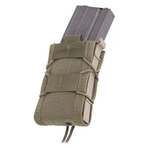 The injection-molded polymer sides and durable Cordura fabric make the pouch highly wear-resistant. A shock cord lacing locks contents securely into place without hindering quick deployment. Webbing tabs at the top allow for attachment of bungee retainers for added security. A loop Velcro patch sewn into the pouch’s interior fastens Velcro-backed magazines in place, preventing shifting while in transit.