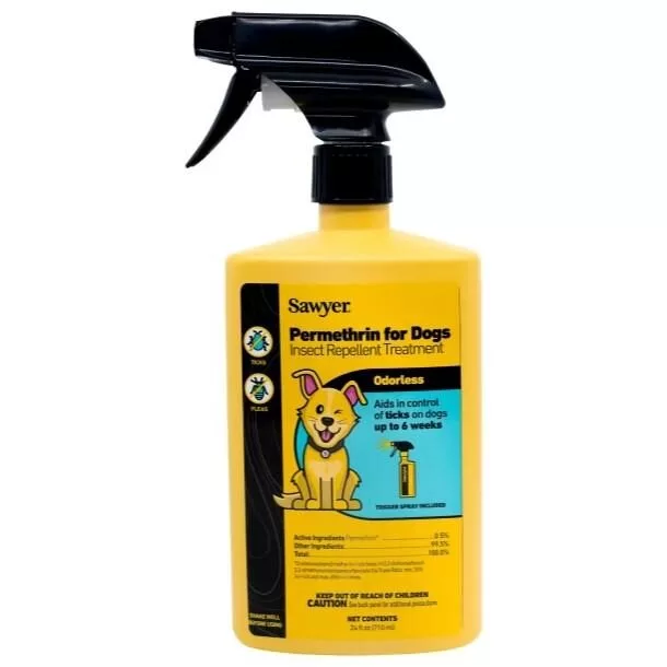 Sawyer Permethrin Insect Repellent Treatment for Dogs controls ticks for up to 6 weeks and fleas and lice for 35 days. The odorless treatment can be used to treat dog beds kennels seat covers and more without harm to fabrics or finishes. Sawyer Permethrin Insect Repellent Treatment for Dogs is effective for 6 weeks or 6 washings on fabric. It effectively repels and kills ticks which can carry Lyme disease and Rocky Mountain Spotted Fever. 24-oz. trigger spray. Note: Do not use on cats.