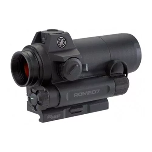 The ROMEO7 full-size red-dot sight provides the civilian and armed professional with a robust 1x aiming solution optimized for today‚s MSR platforms, regardless of caliber. The battery life lasts an amazing 62,500 hours (on medium setting) and the low AA battery compartment allows for quick battery replacement without having to remove the sight from the firearm. The high performance lens coating allows for not only excellent light transmission and zero distortion, but also allows for the highest possible dot brightness. Features Low Dispersion (LD) glass lens design with high performance coatings for excellent light transmittance and zero distortion. The 2 MOA dot is optimal for close quarters battle to mid-range target engagement. The ROMEO7 includes both a standard QD mount and a low-rise fixed mount to fit a variety of systems. Dependable waterproof (IPX-7 rated for complete water immersion up to 1 meter) and fog-proof performance. The ROMEO7 was engineered with the centerline of the optical axis at 1.535” above the top of an M1913 Picatinny rail interface for night vision compatibility.