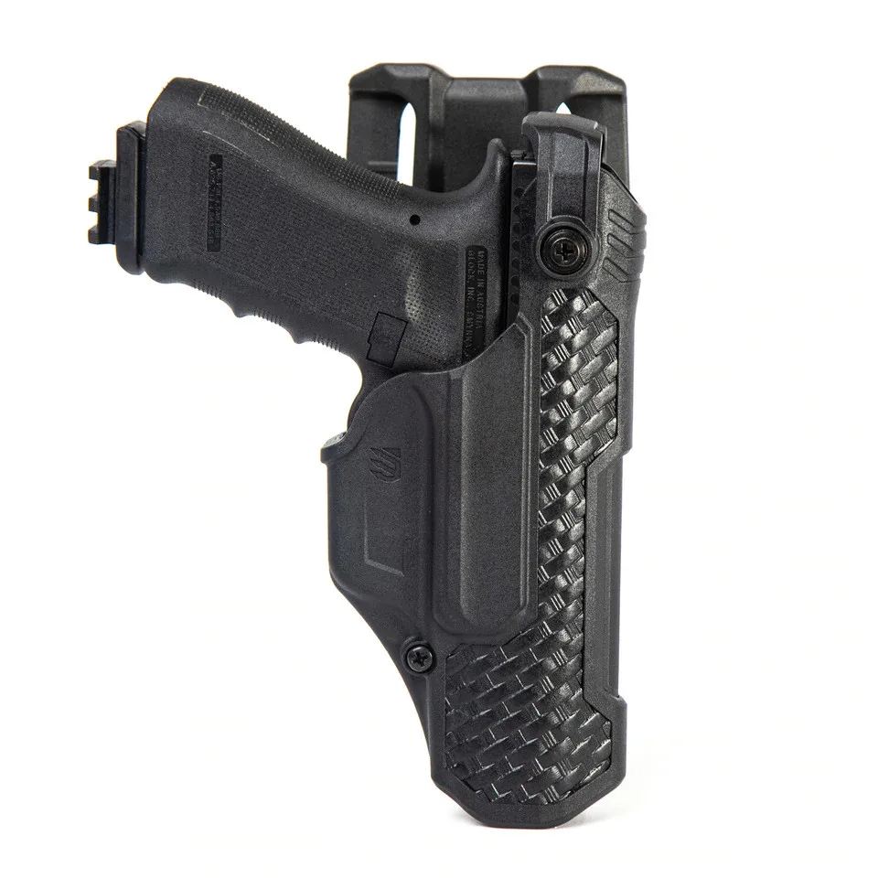 With its streamlined thumb-activated retention, the T-Series L3D keeps your firearm at the ready while maintaining total security. Thanks to a drawing motion that operates off of the Master Grip Principle, you’ll be able to get into the fight under even the most stressful of circumstances. A combination of reinforced outer polymer and smooth, sound-dampening, hydrophobic lining ensures your T-Series will perform no matter the elements and situation. As an added measure of security, the L3D also features a strap across the back of the firearm. Included with Jacket Slot Belt Loop attached to holster. QDR and 2-Slot Belt Loop sold separately.