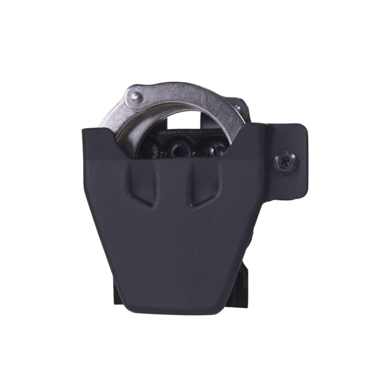 The Uniform Line Handcuff Pouch is made from aircraft grade Kydex making it durable with a sleek duty appearance. It is ambidextrous and retention adjustable to properly secure cuffs based on user preference. It has a flared top that lets the user more easily insert handcuffs into the pouch. It has a hole pattern that allows for diverse mounts and cants with other Comp-Tac accessories.