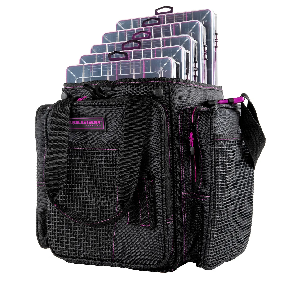 With its open top feature and extremely rugged wear-resistant 1680D construction, the Drift Series Topless Vertical Tackle Bags deliver the quality and functionality that Evolution Fishing is known for. These Drift Series Tackle Bags have an innovative large mouth, open top feature that provides quick and easy access to all your trays. Slide your trays in vertically with this version of the tackle bag. The integrated tie down Y-Strap will secure your trays in the bag, and in case of stormy weather, these bags are equipped with an integrated rain fly that you can zip up and store away when not in use. With 3 large exterior storage pockets and 4 rubber mesh slip pockets, you’ll have plenty of room to store all your accessories. It’s also equipped with a plier holster, side pocket line spool feed, and a non-slip, waterproof bottom with integrated drainage grommets. Transporting these tackle bags will be a breeze with the adjustable, removable shoulder strap and the padded top carry handle. With the capacity to hold up to 5 tackle trays, it’s more than capable of holding all your fishing essentials. Each tackle bag will include 5 matching color Drift Series Tackle Trays.